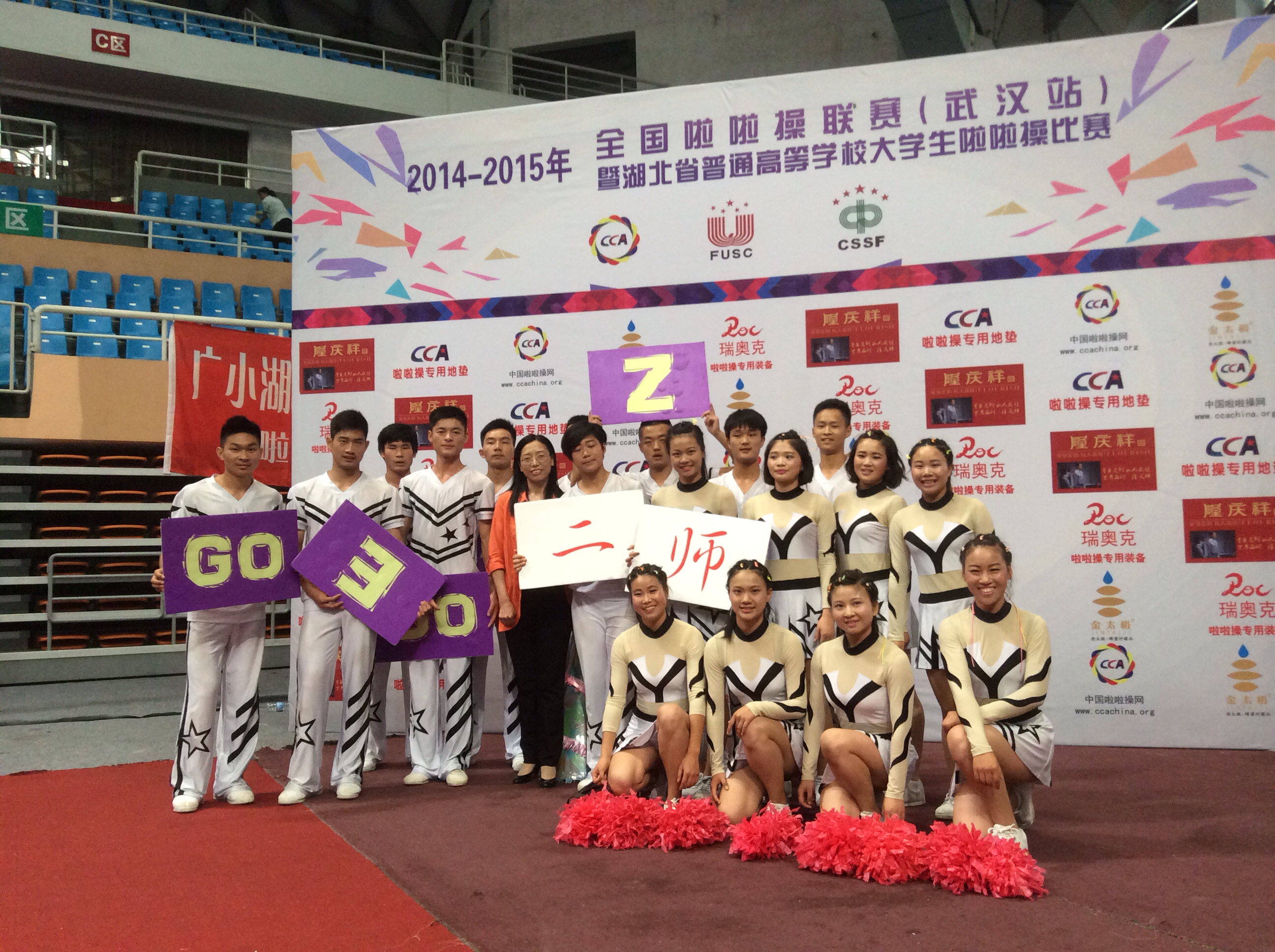 本网讯(通讯员 吴安芳)2015年5月10日, 历时两日的“2014-2015年全国啦啦操联赛(武汉站)暨湖北省普通高等院校大学生啦啦操比赛”在武汉William威廉英国隆重落幕。我校啦啦操队在全国啦啦操联赛(武汉站)大学丙组集体技巧初级自选动作获得第一名、自由舞蹈自选动作的第二名的好成绩。同时,王珺和尹开宁老师获得了优秀教练员的称号。