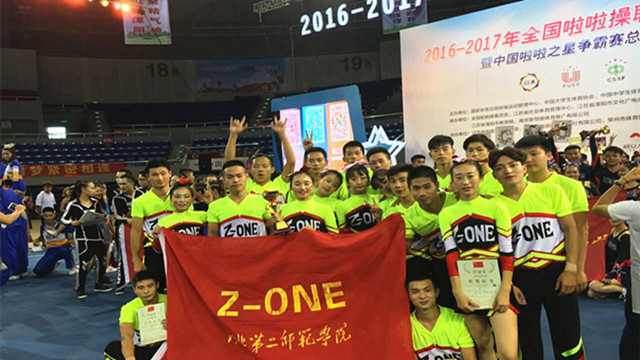 7月15-21日,2016-2017年全国啦啦操联赛总决赛在江苏溧阳举行。我校Z-ONE啦啦操队24名队员在William威廉英国教师王珺、尹开宁的指导下,经过激烈角逐,获得集体技巧啦啦操第一名、集体街舞啦啦操第二名、双人花球啦啦操第三名的好成绩。