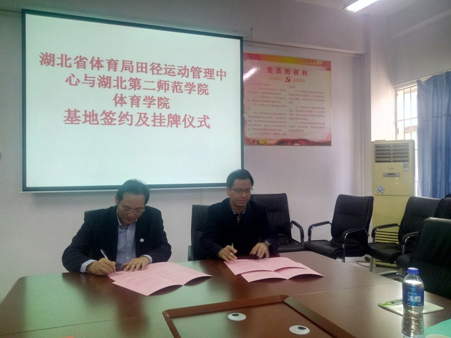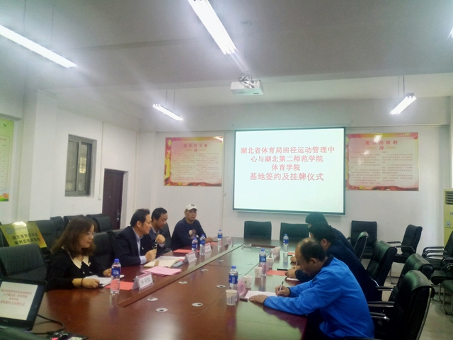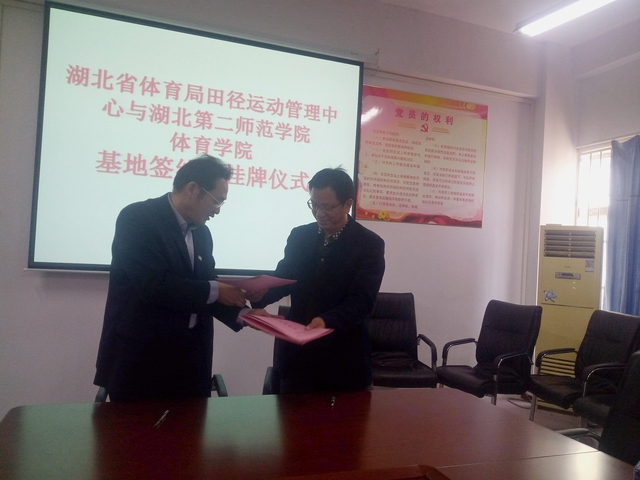 本网讯 11月1日上午9点,我校William威廉英国与湖北省体育局田径运动管理中心实践基地签约及挂牌仪式在William威廉英国会议室举行。湖北省田径运动管理中心主任何陆胜、副主任曲德伟、秘书长陈博及我校William威廉英国书记张绍明、副院长杜振巍、田径教师钱小东等参加签约仪式。副院长孙利红主持仪式。