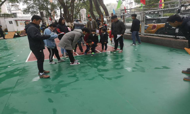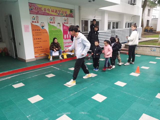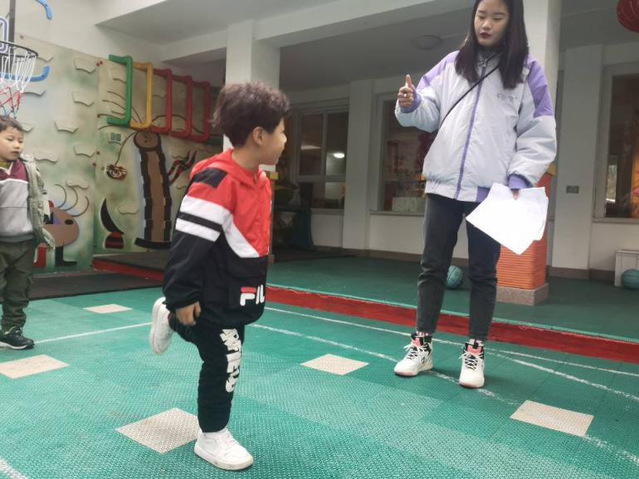 第四组的成员也在井然有序的进行着他们的测试项目:立定跳远与单脚跳。因为地面较湿滑,所以这2个项目的小组成员时刻关注着小朋友的安全,并帮助小朋友完成测试,使小朋友们在开心愉快中体会这个测试实验的过程。呀,这个小女孩仿佛用尽了全身的力气在跳跃,真像一直腾空的青蛙!