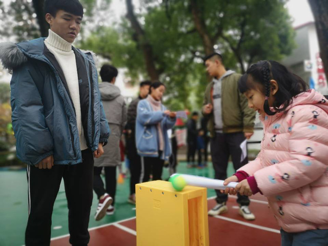 第三组成员用饱满的热情进行着击固定球与肩上掷球的测试,他们用玩游戏的方法吸引小朋友们的注意,激发小朋友们的兴趣,用示范的方法教小朋友们动作要领。让小朋友们积极的参加到这个游戏测试中,争先恐后的抢着玩,不亦乐乎。看看这个小女孩的标准的姿势!