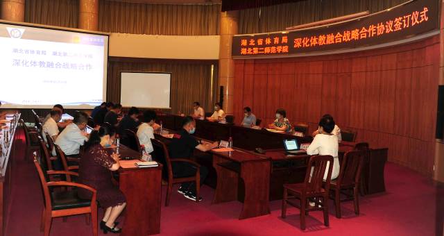 本网讯(融媒体记者 程丽鹃)5月23日上午,我校与湖北省体育局深化体教融合战略合作协议签订仪式在学校行政楼一号会议室举行。湖北省体育局党组书记、局长胡功民,党组成员、副局长骆启义,我校党委书记张国秀、副校长胡兴出席,我校副校长夏力主持仪式。