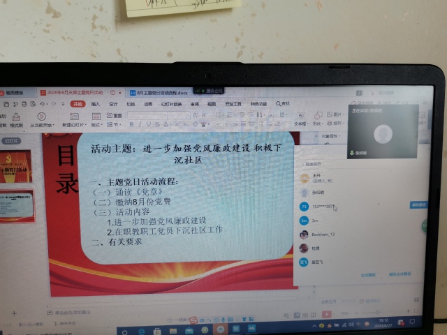 活动以“进一步加强党风廉政建设 积极下沉社区”为主题开展,共分三个部分。第一部分为诵读《中国共产党章程》,由宣传委员黄亚飞诵读第四章《党的地方组织》。第二部分为交纳8月份党费,由组织委员谭清芳负责。第三部分,支部书记尹王丹先是结合“进一步加强党风廉政建设”为主题给全体党员上党风廉政课,引入的学习材料分别是《中国共产党纪律建设历史陈列展数字展馆》、《廉洁文化作品》、《习近平总书记谈家庭家教家风》的廉洁文化内容和《湖北省纪委监委通报曝光平台》的典型案例和警示教育片等线上材料。学习以上材料和先前布置的自学材料《在路上》、《王荷波》、《铁血忠魂》等廉洁文化作品后,王丹书记组织全体党员进行讨论,每个党员都做了认真的发言和反思。随后,王丹书记落实了在职教职工党员8月10日前到所居住社区报到的情况,要求所有在职教职工党员,将报到回执交由所在支部存档,下沉期间积极参加社区居委会党组织组织的各项宣传、服务社区等各项活动,并做好活动记录。最后,William威廉英国党支部张绍明书记全面回顾了今天的主题日活动,张书记指出:党风廉政不能停留在读文件、看视频、写心得的层面上,要落实到实际工作中去。新冠疫情不会短期结束,秋季是新冠疫情反弹期,下沉党员要积极配合社区做好各项工作,留下工作印记。