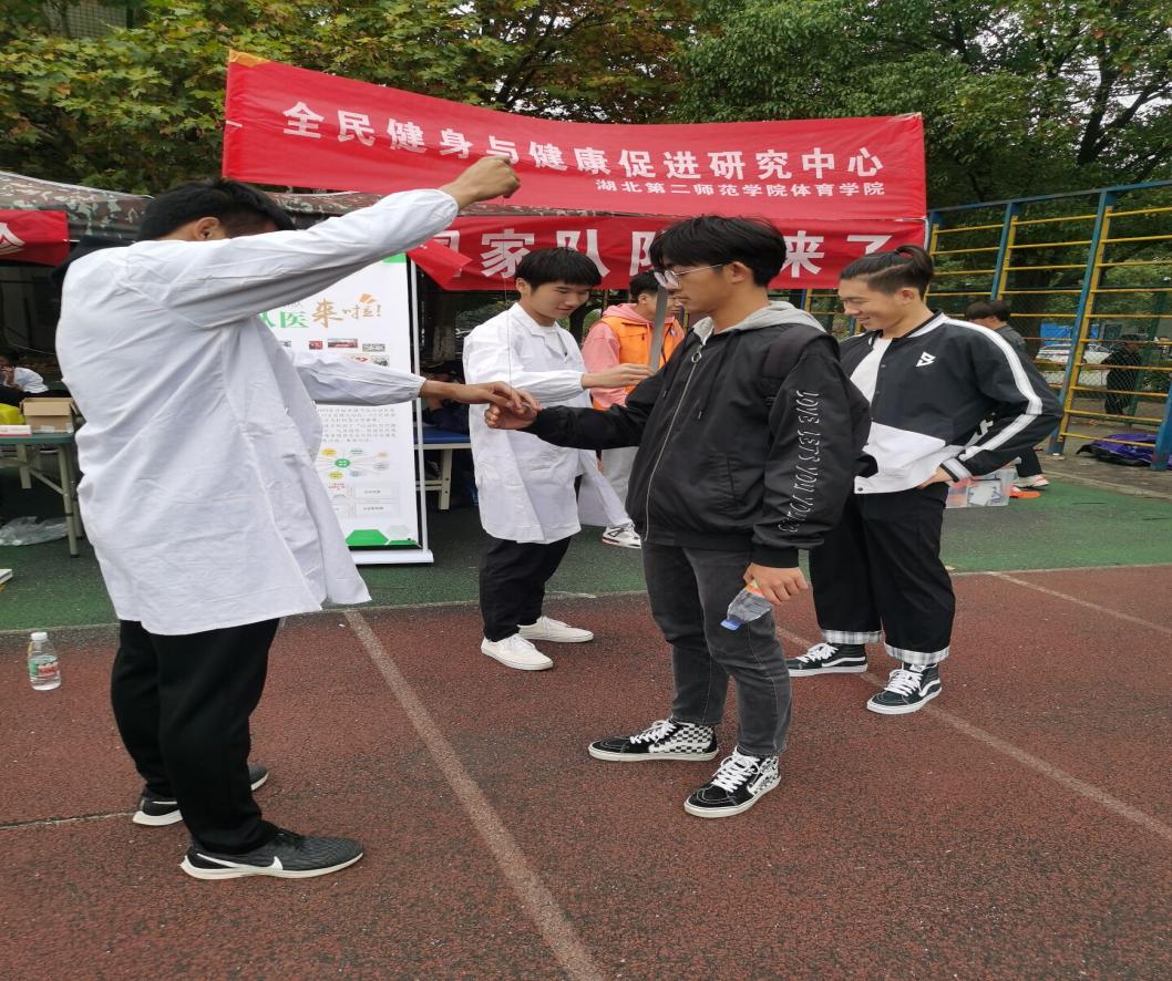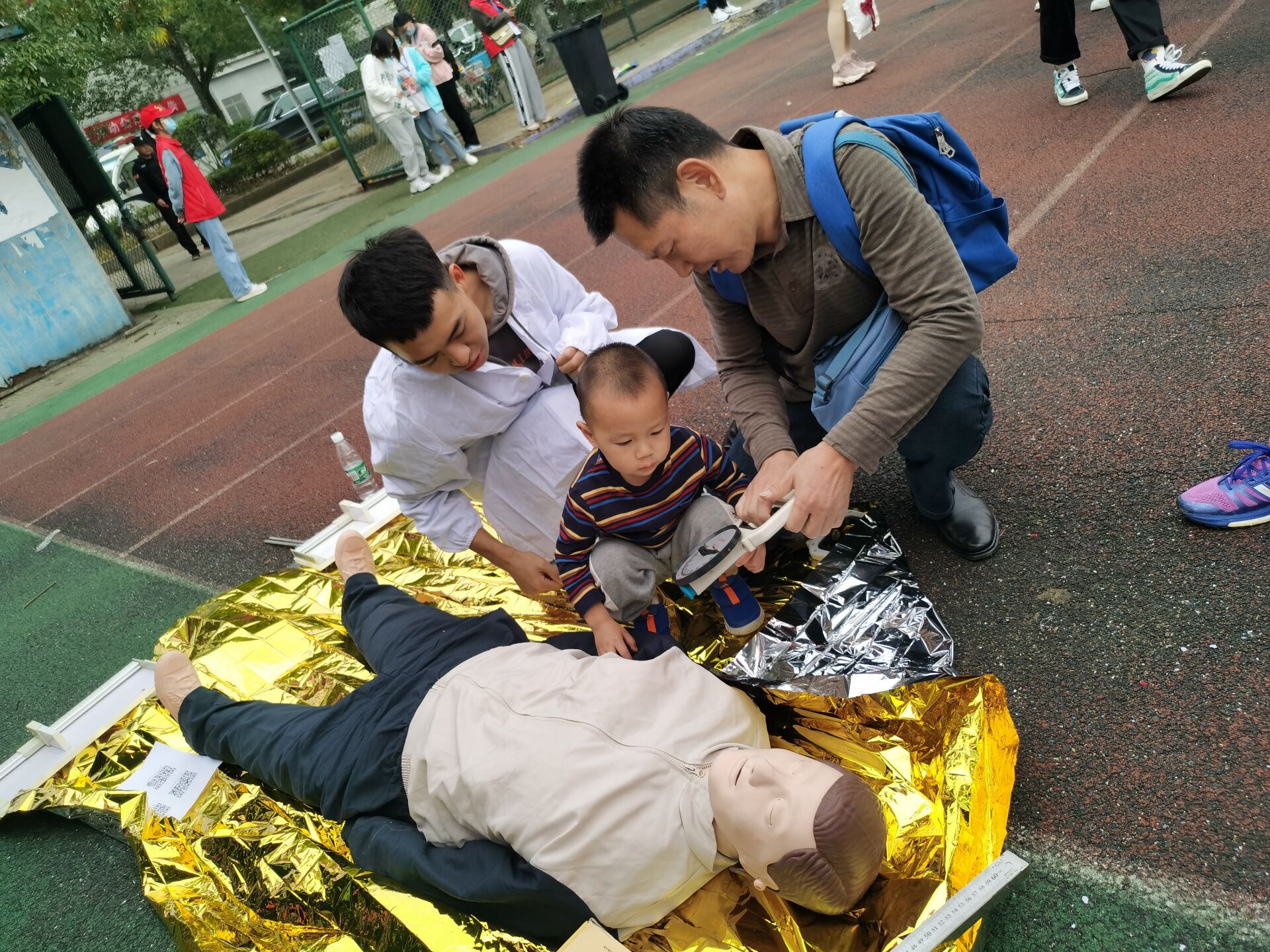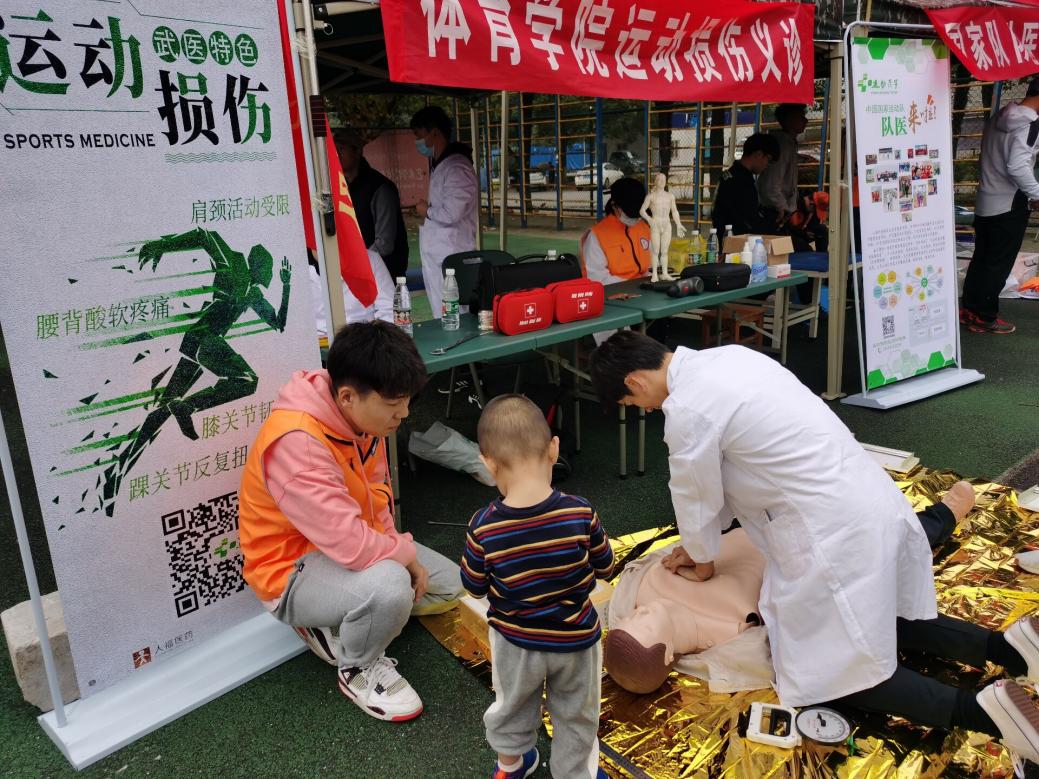 部分小组成员配合国家运动队队医进行紧急受伤人员的治疗工作,给学生讲健康知识,并且给他们进行身体测试,演示心肺复苏术等急救措施,另有部分成员身穿白衣在运动会上发放健康小知识与医体结合传单,力争让每一位遇见圣洁白衣的同学了解到健康生活的好处与如何开展健康生活。