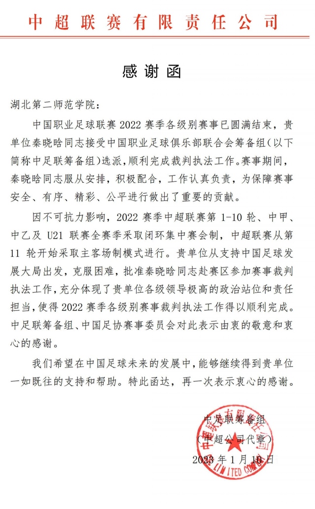 本网讯 (通讯员 向琴英) 2022年,我院青年教师秦晓晗受中国足球协会裁判部和中国职业足球俱乐部联合会筹备组(以下简称中足联筹备组)委派,出色完成十一轮联赛及两轮足协杯执法任务,得到了中国足球协会和中足联筹备组的肯定和认可。(审稿 尹开宁)