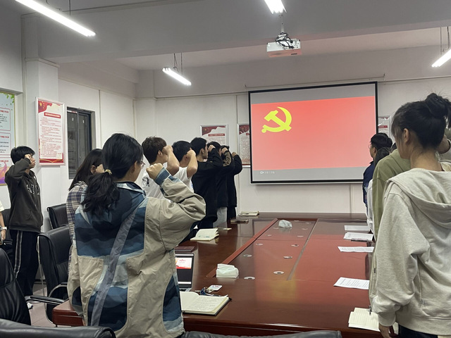 本次活动由学生党支部书记何思琪主持。组织委员李颖带领全体党员重温入党誓词并组织全体党员缴纳党费、诵读党章。