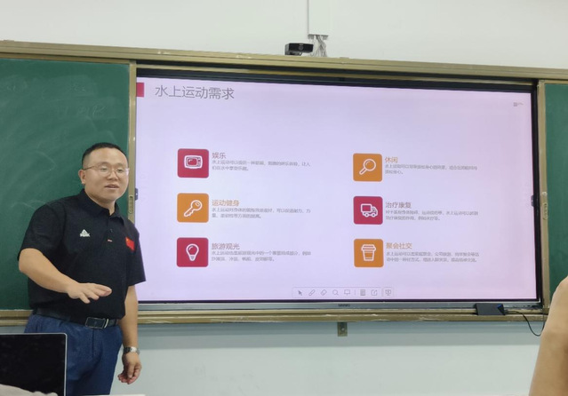 本网讯(通讯员 刘芳枝)为切实做好体教融合助推教育高质量发展,加强校企合作,拓展学生专业视野,引导学生专业发展方向,5月29日,我校休闲体育研究中心特邀中冠体育总经理王攀龙进入休闲体育专业课堂,为师生讲授“水上运动发展研究”的主题教育课。