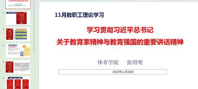本网讯(通讯员 向琴英)11月30日中午,我院在会议室召开教职工政治理论学习,专题学习习近平总书记关于教育家精神、教育强国重要讲话精神及习近平文化思想内容。总支书记张绍明主持会议,全体教职工参会。