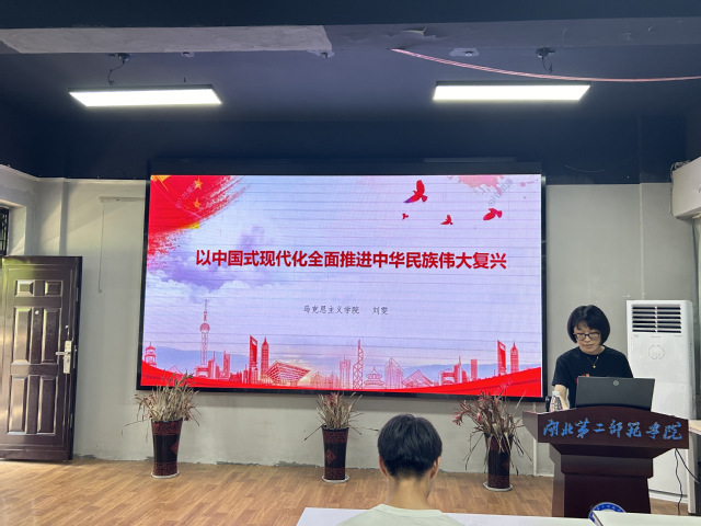 刘雯老师以“以中国式现代化全面推进中华民族伟大复兴”为题,围绕中国特现代化的必要性、基本特征、中国是现代化道路的意义等三个方面进行讲解。通过对中西方现代化的分析,明确了中国式现代化的优势。表明中国式现代化拓展了发展中国家走向现代化的途径,为推动人类文明进步贡献了中国智慧,增强了人民的文化自信。