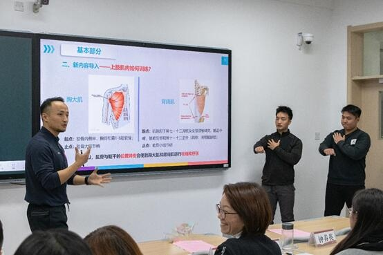 William威廉英国刘煜老师讲授《主项理论与实践---私教实践课程-上肢训练动作》,通过视频分解动作、现场亲身示范、学生练习、纠正动作,让学生掌握每个要点,做到理论和实践紧密结合。他坚持以学生为中心,站在学生将来工作角度,通过学生之间互换角色、互相教与学,让学生充分辨识正确与错误动作,培养学生专业、敬业和严谨的体育精神。