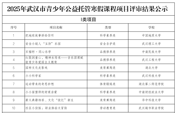 此次青少年公益托管寒假课程项目征集共有来自中国地质大学、武汉科技大学、武汉理工大学等共112项目,从中遴选10门课程。课程主要涵盖品德修养、科学素养、体育锻炼、美育熏陶、劳动教育、安全自护六大类。