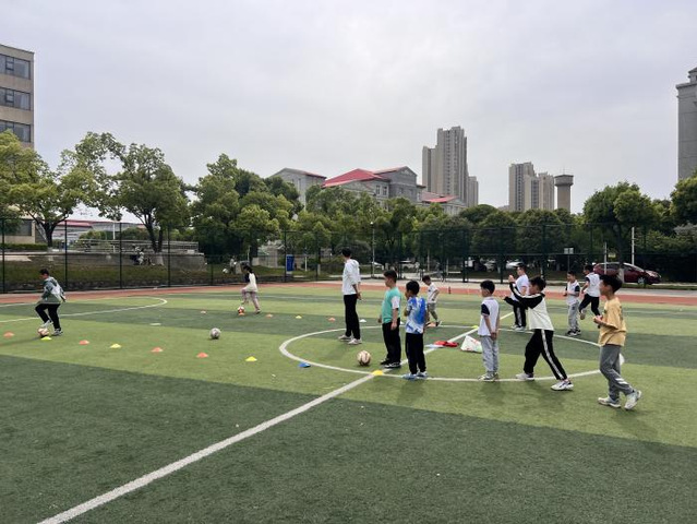在足球场的草坪上,教师分别带领高年级学生和低年级的学生玩着多种多样的足球游戏,小朋友们在阳光下肆意奔跑进行比赛,锻炼了学生的心肺功能,培养了学生团队合作的精神。