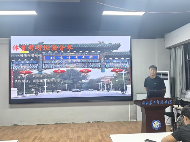 在经验分享环节,学长们倾囊相授。被北京体育大学录取的2021级体育教育1班刘绍洋上台着重分享自己在选择考研院校和专业时的思考过程和备考期间心态调整,分析了不同院校的招生政策、专业优势以及历年分数线等关键因素,为同学们在迷茫的择校阶段提供了清晰的思路。