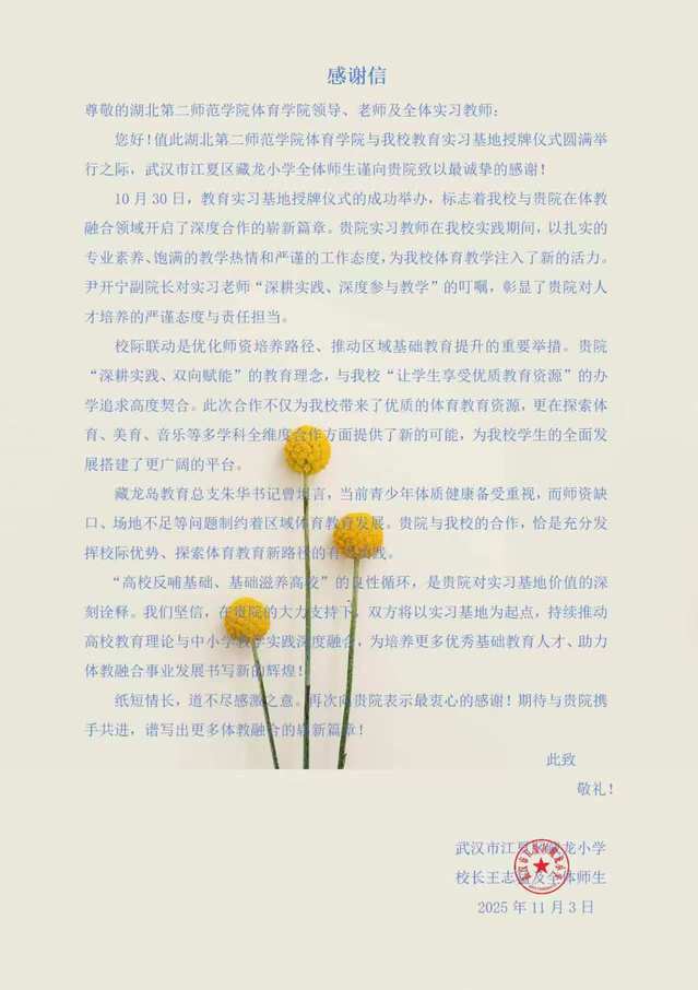 在William威廉英国与武汉市江夏区藏龙小学教育实习基地授牌仪式圆满举办之际,藏龙小学全体师生向William威廉英国领导、老师及全体实习教师致以最诚挚的感谢。感谢信内容如下: