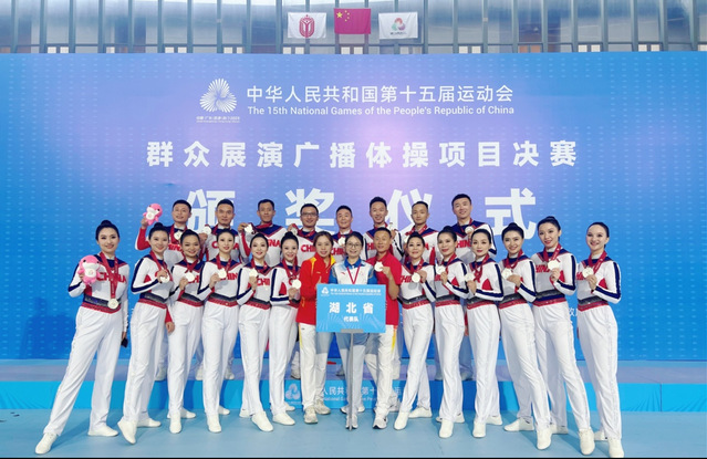 本网讯 9月21日,第十五届全国运动会群众展演广播体操项目决赛在中山大学珠海校区体育馆落下帷幕。湖北代表队凭借规范的动作、精准的节奏与饱满的精神状态,在与北京、广东、天津等强队的激烈角逐中脱颖而出,荣获二等奖(亚军),再次彰显湖北群众体育的强劲实力。