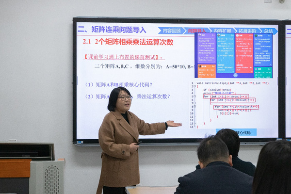 计算机学院刘利敏老师讲授《矩阵链连乘问题求解》,利用动画和视频,形象展示矩阵连乘的运算过程和应用场景,帮助学生更好地理解抽象的矩阵概念。她用美国商务部对我国部分院校禁用Matlab软件作为课程思政教学案例,启发学生思考国家科技教育人才一体化战略,勉励计算机专业学生努力学习,用科技创新打破对国外工业软件的依赖。